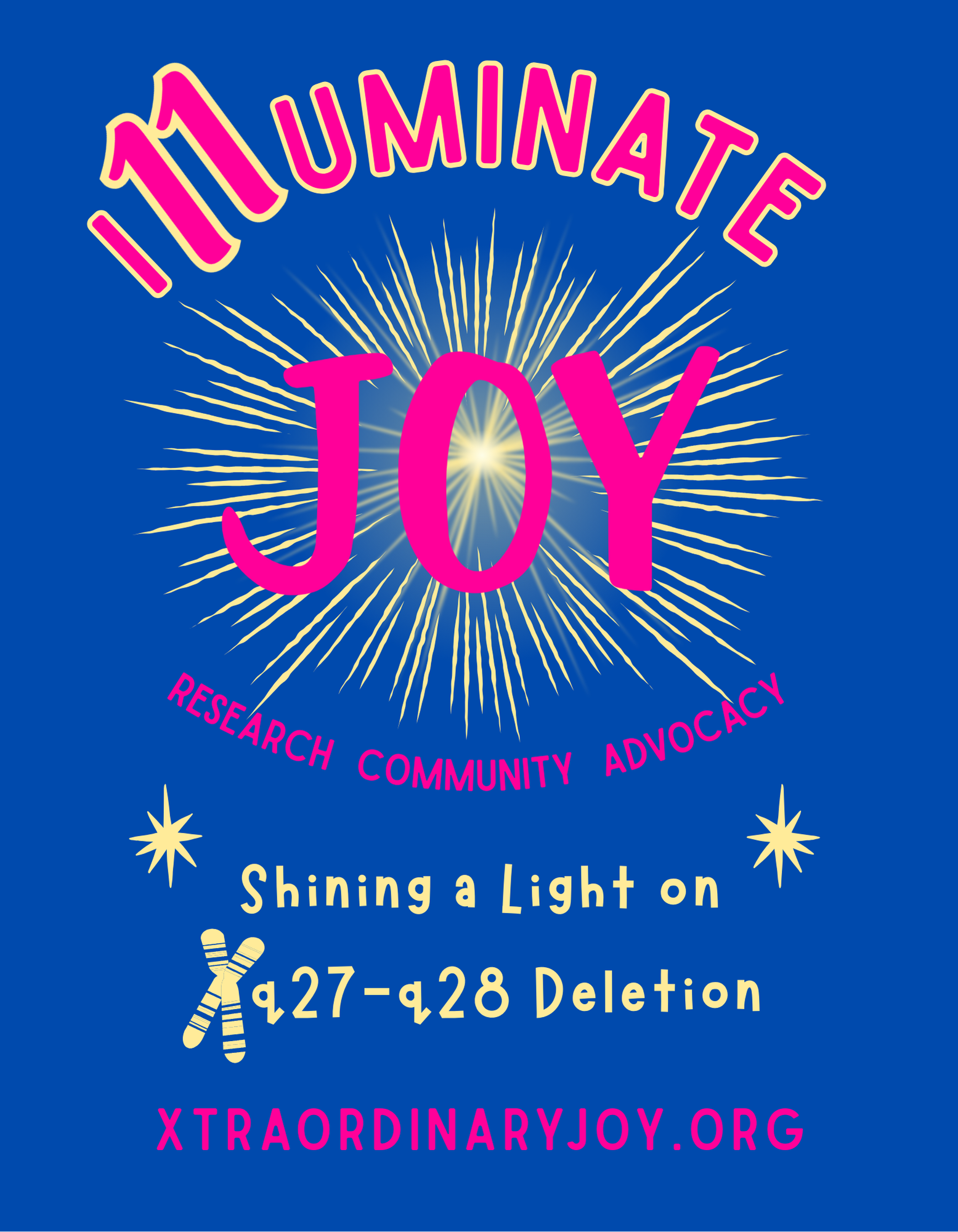 Established in 2016, our vision for Xtraordinary Joy, Inc. is to raise funds that will promote clinical interventions, therapies and care opportunities for children afflicted by never-before-studied X chromosome deletions.